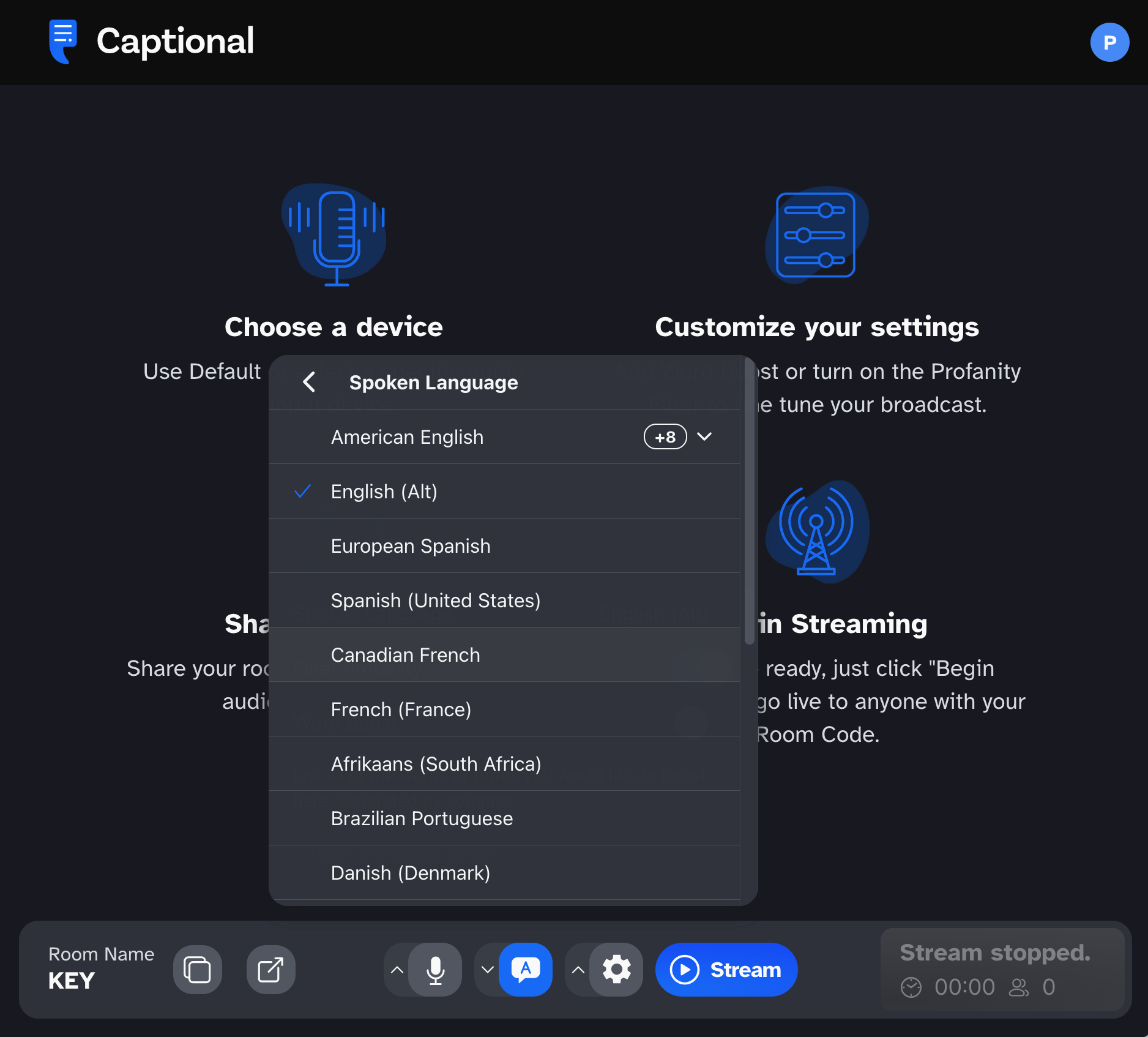 This tells Captional what language to transcribe. From there, the platform generates real-time AI captions and makes them available for translation into whatever output languages viewers select.